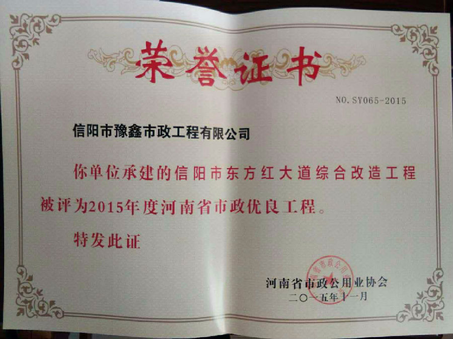 好風憑借力,送我上青云。近年來,公司積極參與城市市政基礎設施建設施工,積極參與市場競爭,先后承擔施工了市政府重點工程南京路道路改造工程、春曉路道路改造工程,東方紅大道道路改造工程、龍江東路新建工程等重點民生工程,其中南京路道路改造工程被省建設廳評為“中州杯”, 春曉路和東方紅大道道路改造工程被省建設廳評為“省優工程”,成為城區一道道亮麗的風景線。參與施工了市典范小區“臺北城上城”、“恒大名都”以及師范學院、職業技術學院、交警支隊和軍區道路工程,參與施工了雞公山管理區、南灣管理區、明港鎮和羅山縣等部分道路小區工程施工,累計大小各類施工工程三百余項,企業影響力不斷擴大、輻射力不斷增強,市場份額不斷提高,企業信譽不斷彰顯,為信陽城市建設做出了積極貢獻,為企業的可持續發展插上了騰飛的翅膀。